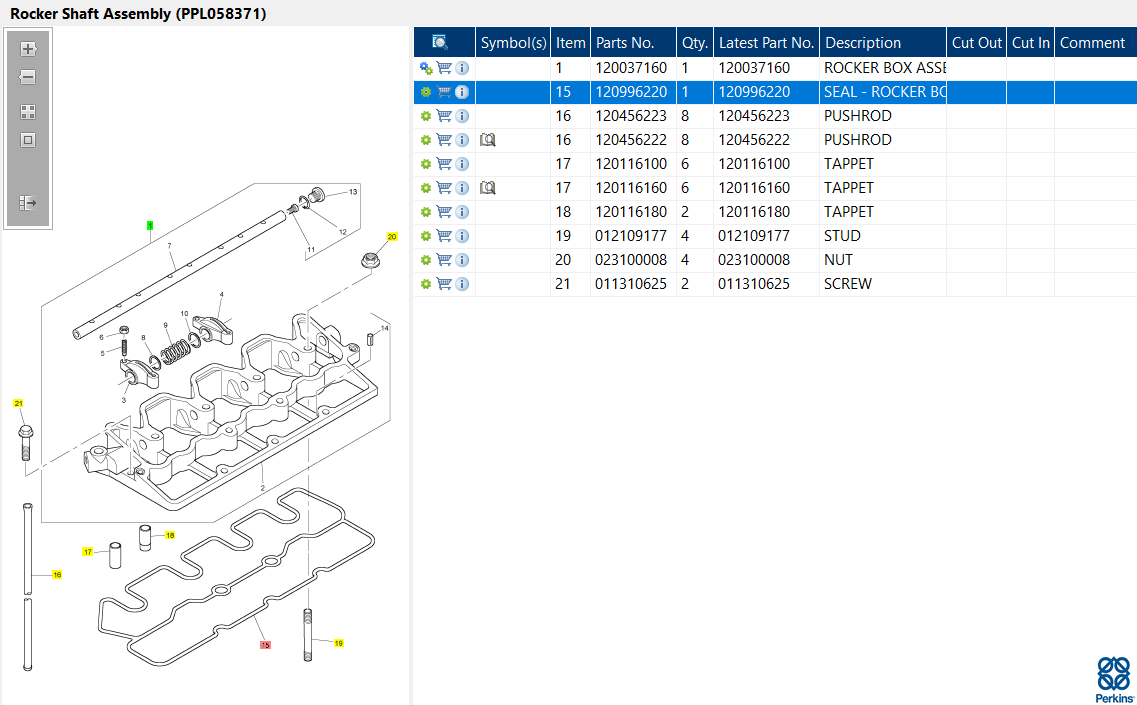 Valve cover or rocker gaskets 120996220 should be changed whenever the tappets are adjusted at the appropriate service interval. Re-using seals and gaskets is not recommended. Perkins gaskets and seals are designed to fit the rocker cover and cylinder head precisely, using specialized materials that deliver an effective seal to prevent oil leaks according to the tightness of the rocker cover bolts.