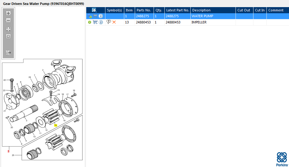 The sea water pump 2488275 is a simple centrifugal pump, electrical or belt driven to circulate sea water as a coolant fluid, which is used to cool the freshwater in the engine cooling system through a heat exchanger. Common signs of wear include coolant leaks, the pulley is loose and making whining sounds, overheating of the engine, or worst case steam coming from the engine. Perkins sea water pumps are designed and made from resistant materials to withstand the effect of corrosive seawater.