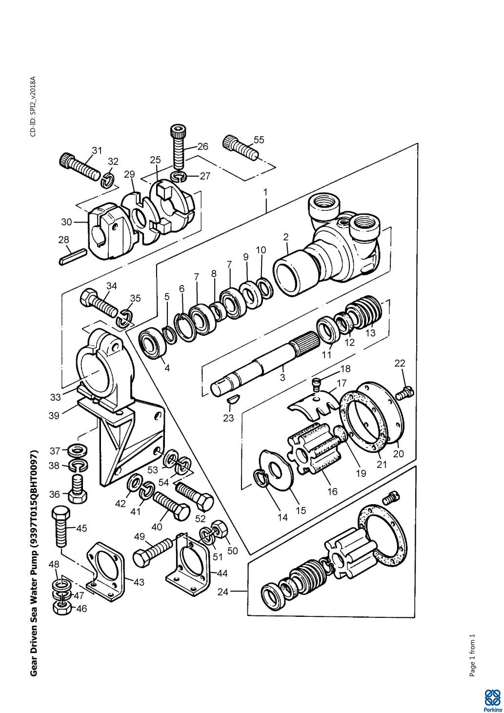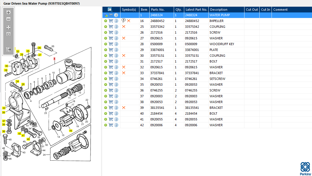 The sea water pump 2488324 is a simple centrifugal pump, electrical or belt driven to circulate sea water as a coolant fluid, which is used to cool the freshwater in the engine cooling system through a heat exchanger. Common signs of wear include coolant leaks, the pulley is loose and making whining sounds, overheating of the engine, or worst case steam coming from the engine. Perkins sea water pumps are designed and made from resistant materials to withstand the effect of corrosive seawater.