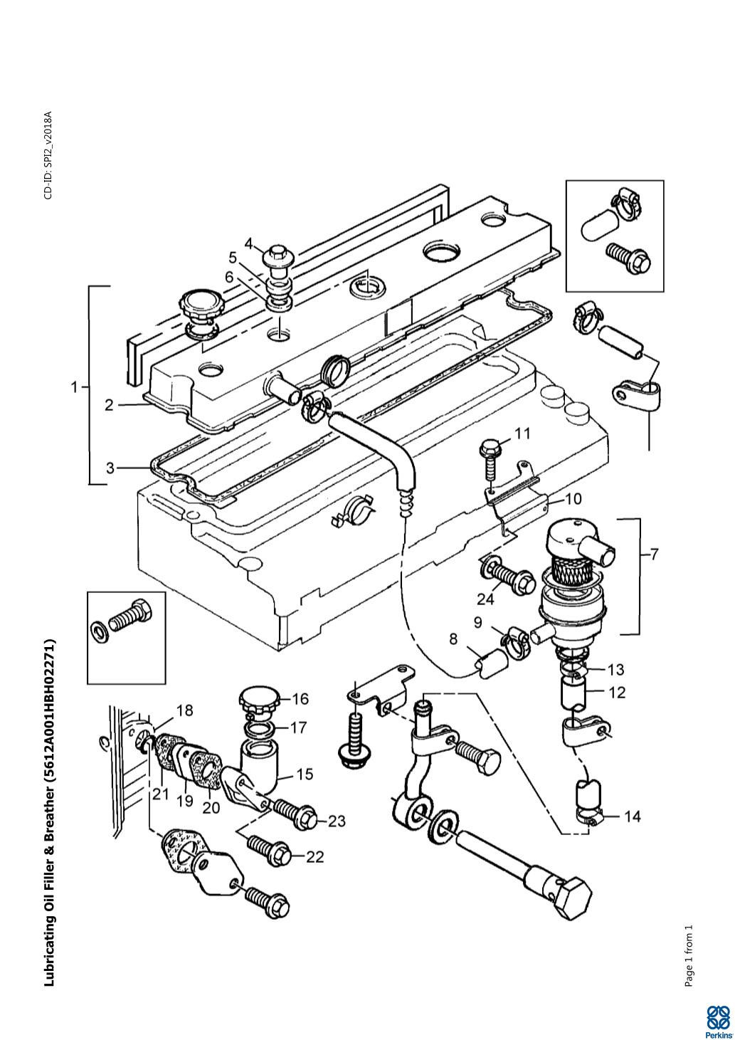 Oil breathers cap 2652A012 allows ventilation of the crankcase, removing combustion bypass gases. These gases contain oil vapors, and the breather filter traps the oil and contaminants. For recommended changing interval see the Operation and Maintenance Manual